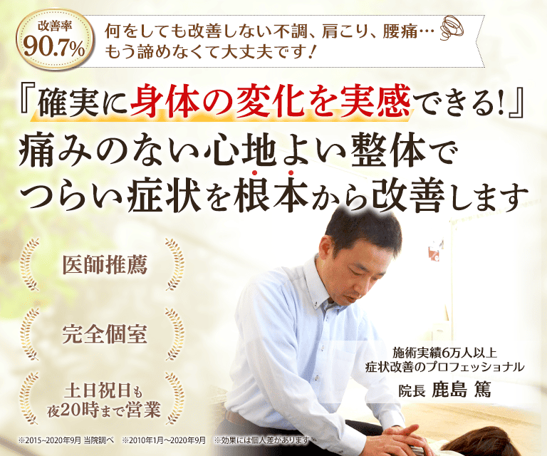 全国には数多くの治療家がいますが、同業者からみても鹿島先生の技術・実力は特に高く群を抜いておられます。結果がすべてのこの業界で頼られる整体院になるということは並大抵のことではありません。口コミの患者様が多いのがその証明でしょう。