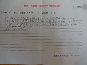 かしま先生に話を聞いてもらい整体の施術を受けるたびに少しずつ体が変わっていきました。妊活にも心のゆとりができてきて焦らなくなりました。体の変化と心のゆとりがあったのか半年後に妊娠できました。ありがとうございました。感謝の気持ちでいっぱいです。