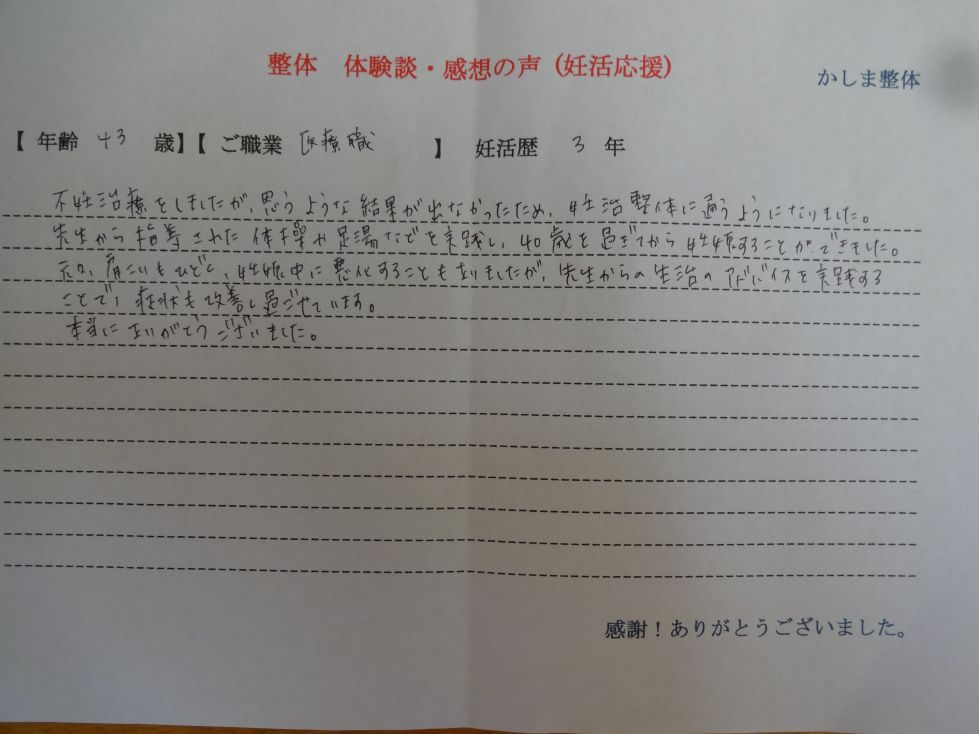 病院で不妊治療はじめて1年経つも、なかなか結果が出ず体づくりが大切とのアドバイスをうけ調べていたら、かしま整体に出会いました。通い始めて3ヶ月頃、治療を再開し妊娠できました。少しあきらめかけていた中で希望を見つけることができ、うれしく思います。ありがとうございます。